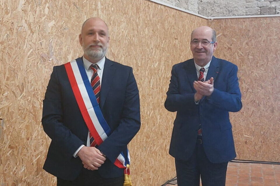 Above: Nicolas Pubreuil received the mayoral sash from his predecessor, Michel Lamarre.